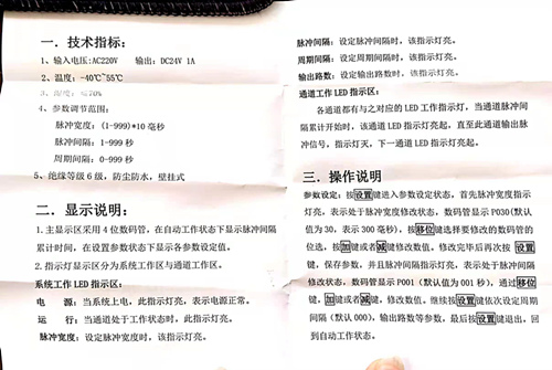 4、脉冲宽度设置:(单位:0.01秒; 大值为0.99秒)按红色功能键,使脉宽指示灯亮,旋转黑色设置键直接调节到所需时间即可。